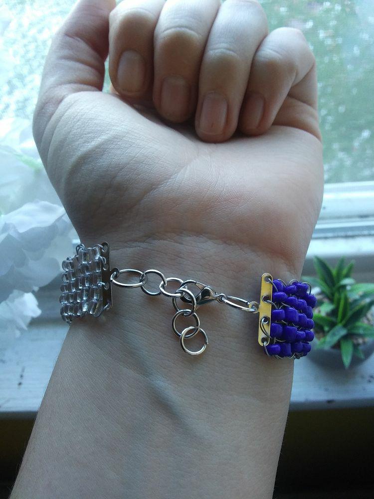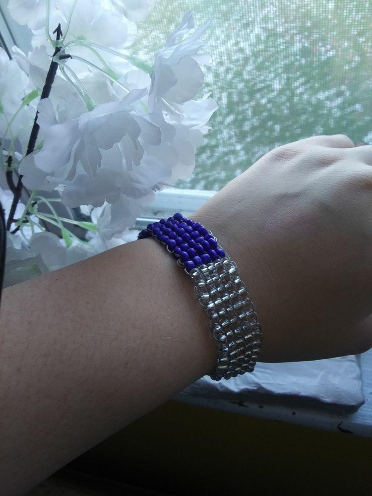 Blue and clear glass bracelet. Loops for adjustable size. Will soon be available in multiple colour combinations. Wide width for comfort and fit.