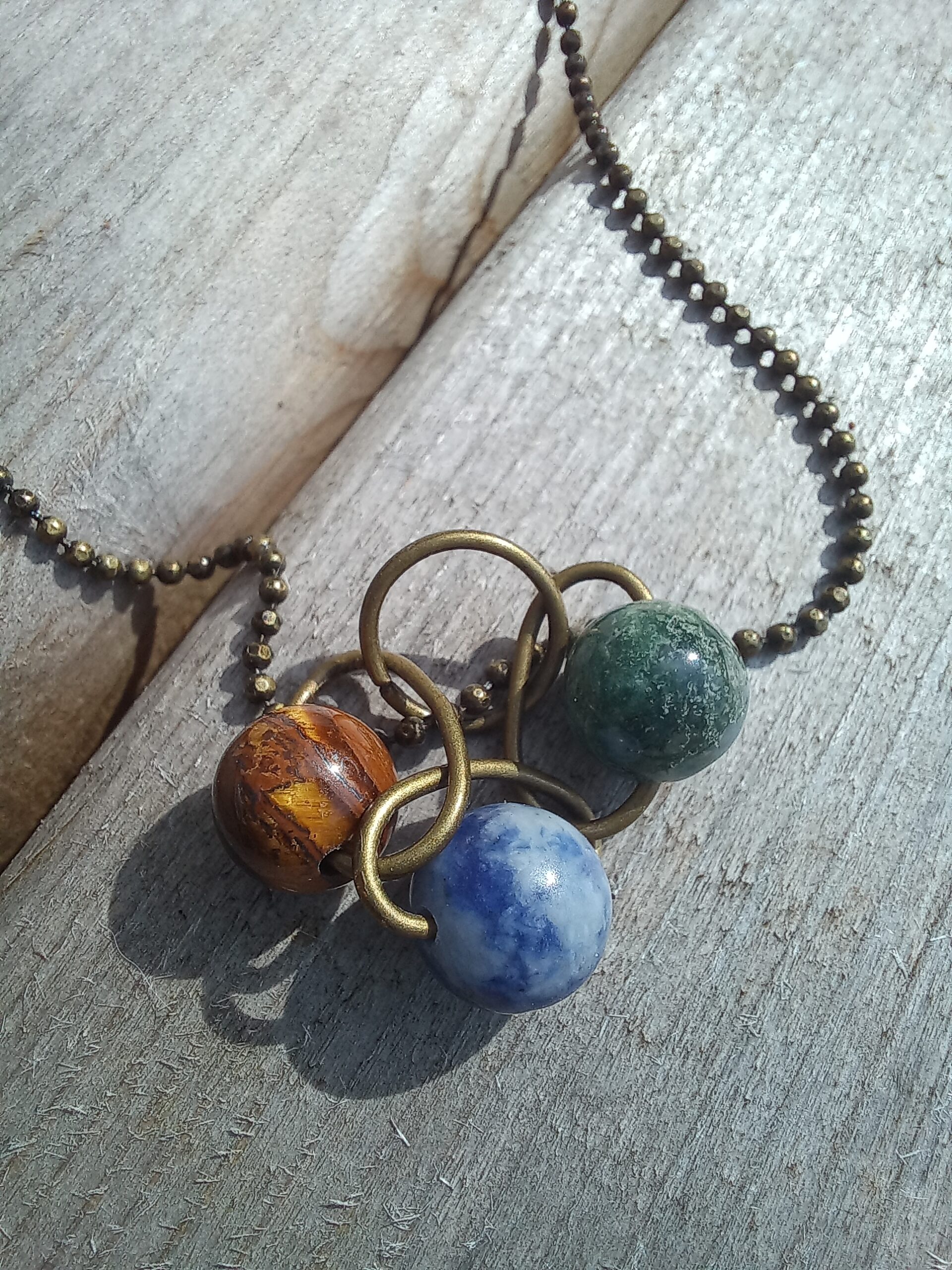 Two different lengths of this tripple stone necklace made with green moss agate, sodalite and tigers eye.